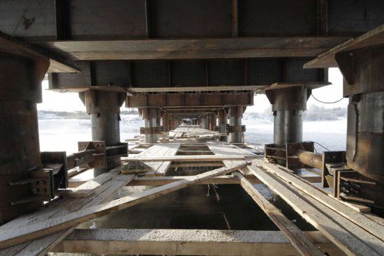 - Монтаж пролетов мы тоже выполняем с помощью различных технологий – с применением лесов, подъемных кранов, подмостей, гидродомкратов. Мы собираем пролеты на берегу либо на стапелях и подвозим к месту работ в готовом виде, где надвигаем с берега на берег по установленным опорам. Другой вариант – навесной монтаж краном (кран движется по уже установленной части полотна).